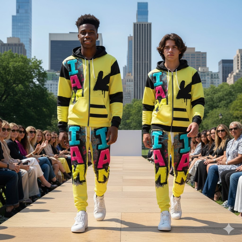 A bold, streetwise zip-up hoodie that channels urban graffiti energy into wearable art. Bright, all-over printing keeps the colors vivid — neon block letters spelling “I AM” and a heart-shaped spray-paint motif give this piece attitude without shouting. The soft yellow background with black accent bands and ribbing creates contrast that reads like a mural on your chest. Wear it zipped for a sharp, graphic silhouette or open for effortless layering. Pockets sit low and roomy so your hands stay warm while you skate, commute, or hang out with friends. Built from durable polyester and custom cut-and-sewn for consistent print placement, this hoodie keeps its shape and dries fast after a rainy day on the streets.