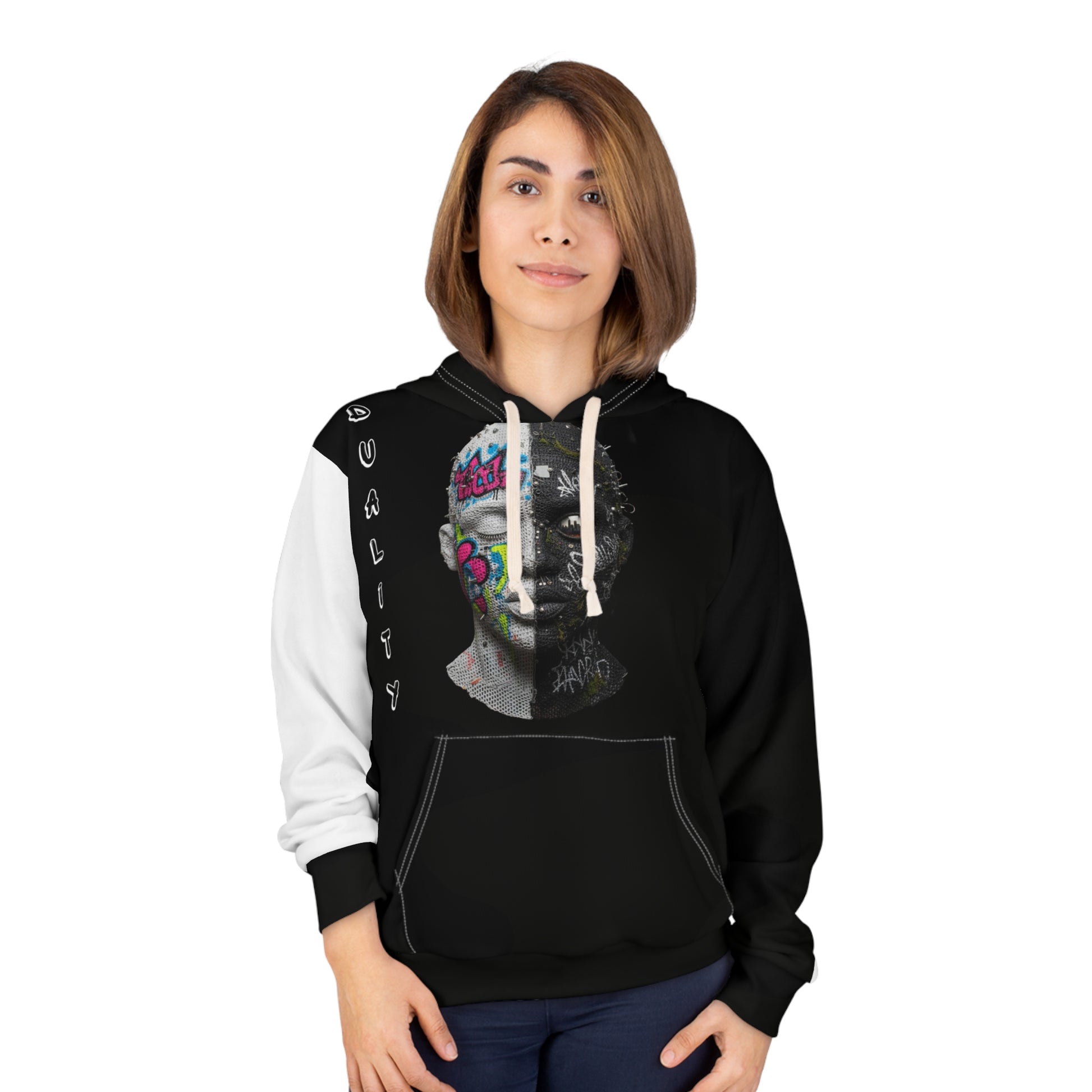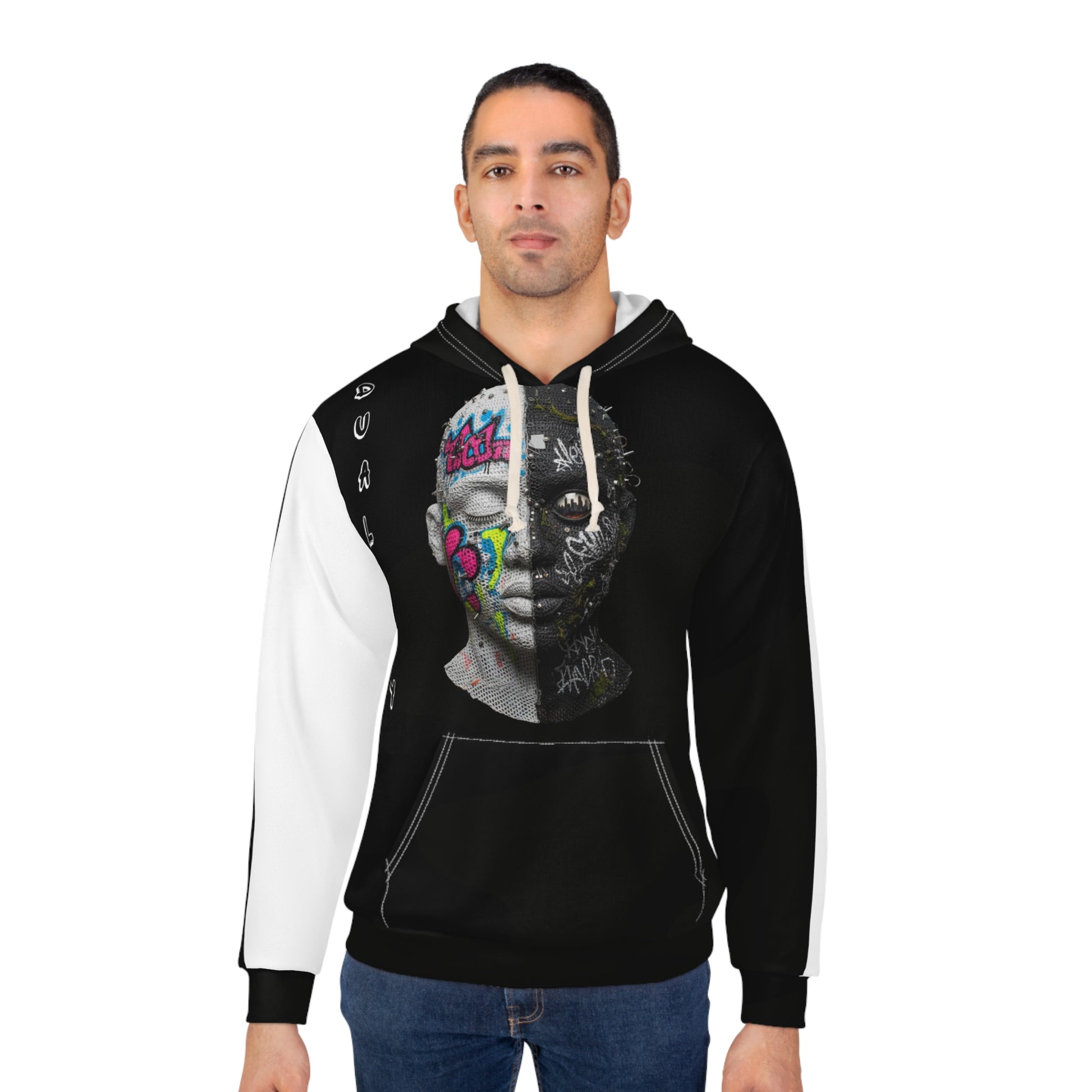 A bold, all-over printed pullover hoodie that mixes stark monochrome with bursts of color to tell a story of contrast and inner life. The front shows a sculpted face split down the middle — one side weathered and grayscale, the other glazed with vivid, graffiti-like pigments — while the back reads “The Colors Within,” driving home a message of hidden vibrancy. The roomy kangaroo pocket and adjustable hood make it wearable every day, and the medium-weight polyester holds the print’s intense hues without losing shape. Wear it when you want your outer calm to meet inner chaos, whether you’re walking city streets, heading to an art night, or layering up for cool evenings at a gig.