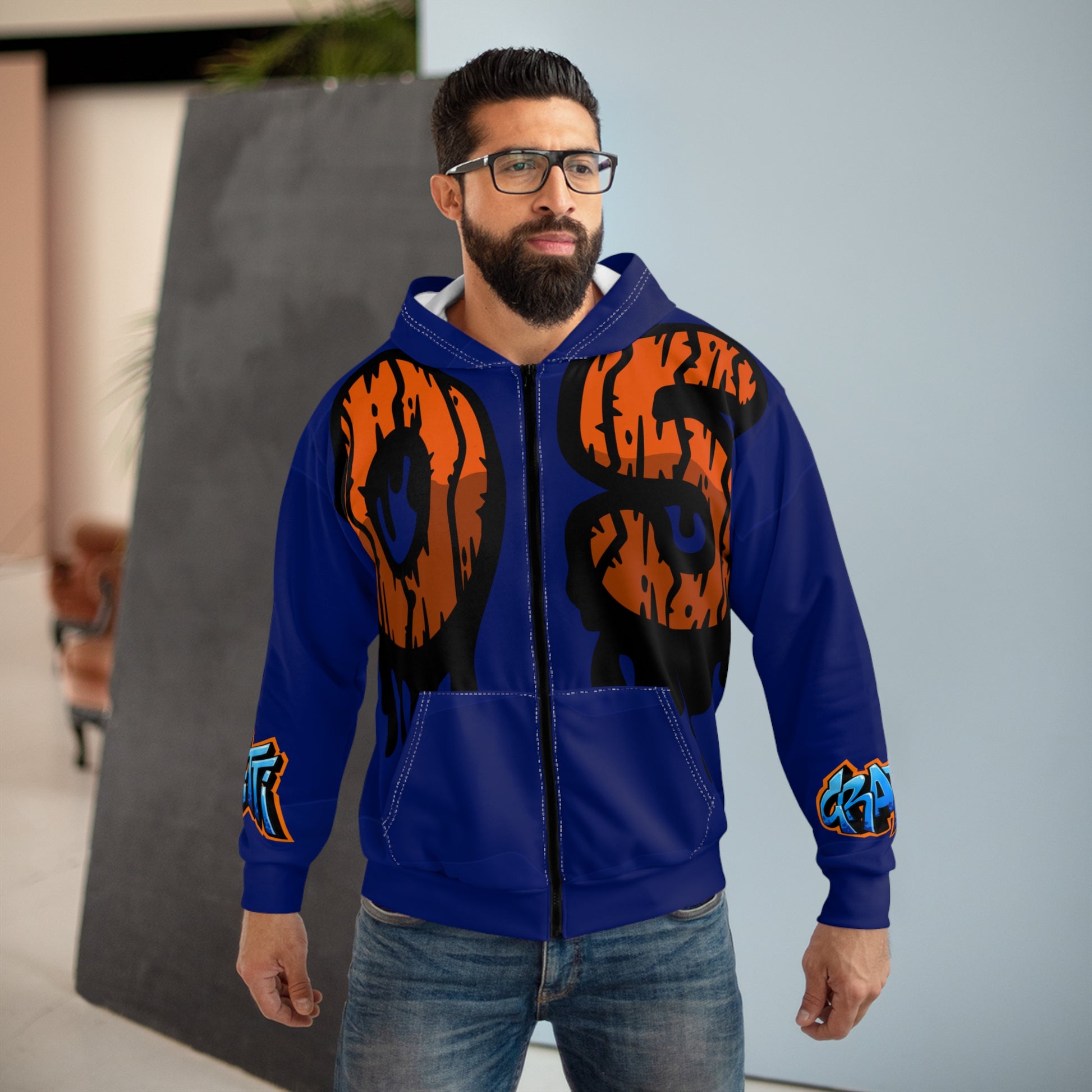 A bold, all-over zip hoodie that wears like a street mural. Deep blue fabric becomes the backdrop for dripping, graffiti-style numerals across the chest and colorful tag art on the sleeves. The roomy front pockets and medium-weight polyester body make it comfortable for layering on cooler nights. Wear it zipped up to let the graphic dominate, or open for a more relaxed vibe — either way it reads as urban attitude and hands-on warmth.