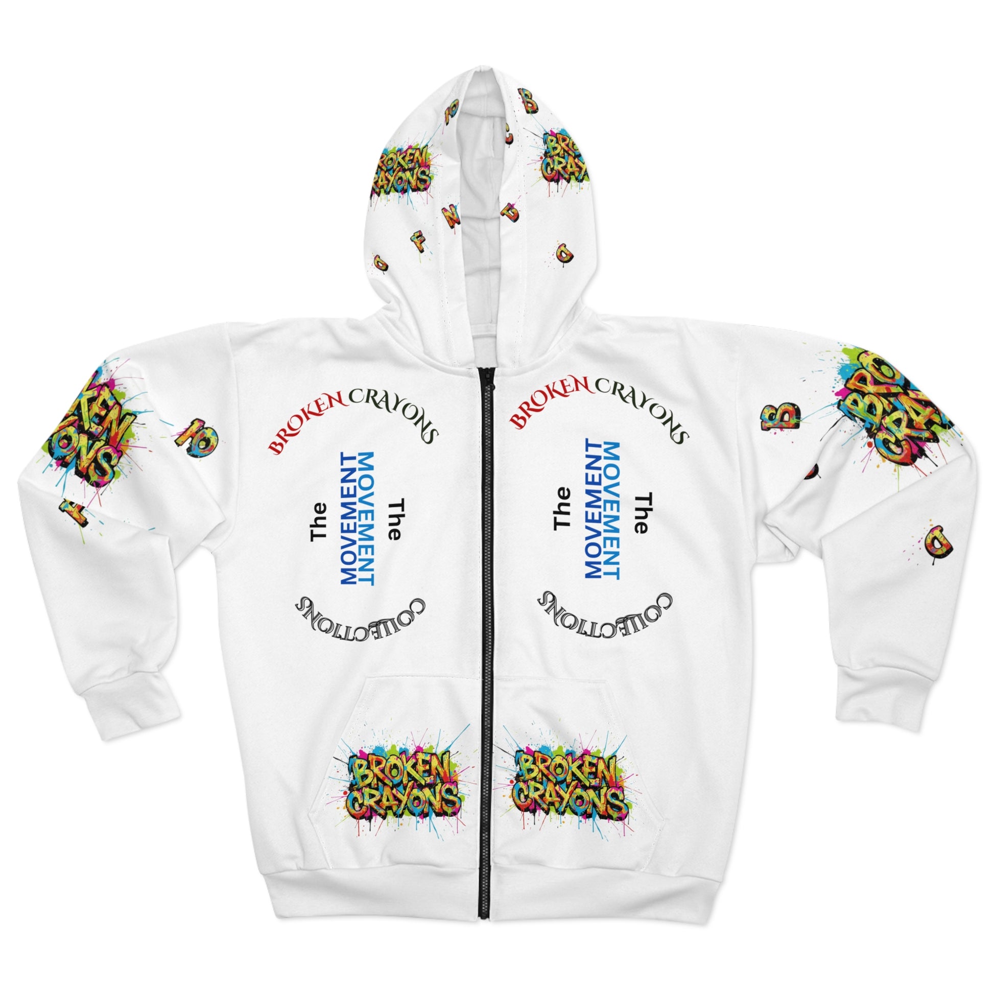 Make a bold statement with our "Broken Crayons" All-Over Print Zip-Up Hoodie! Featuring vibrant, graffiti-style "Broken Crayons" lettering and playful scattered letter accents, this unique hoodie embodies "The Movement." Perfect for anyone who embraces creativity, individuality, and a splash of color in their streetwear. Stand out from the crowd with this eye-catching and comfortable design.