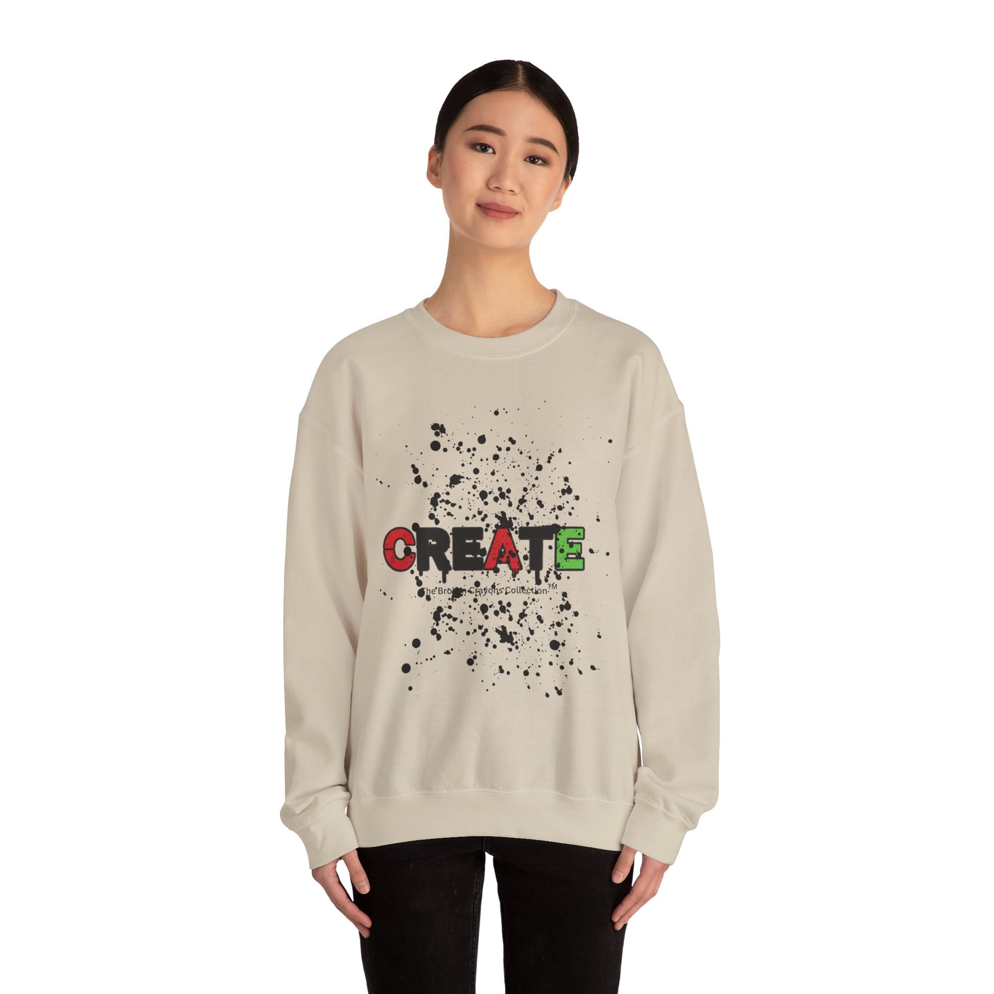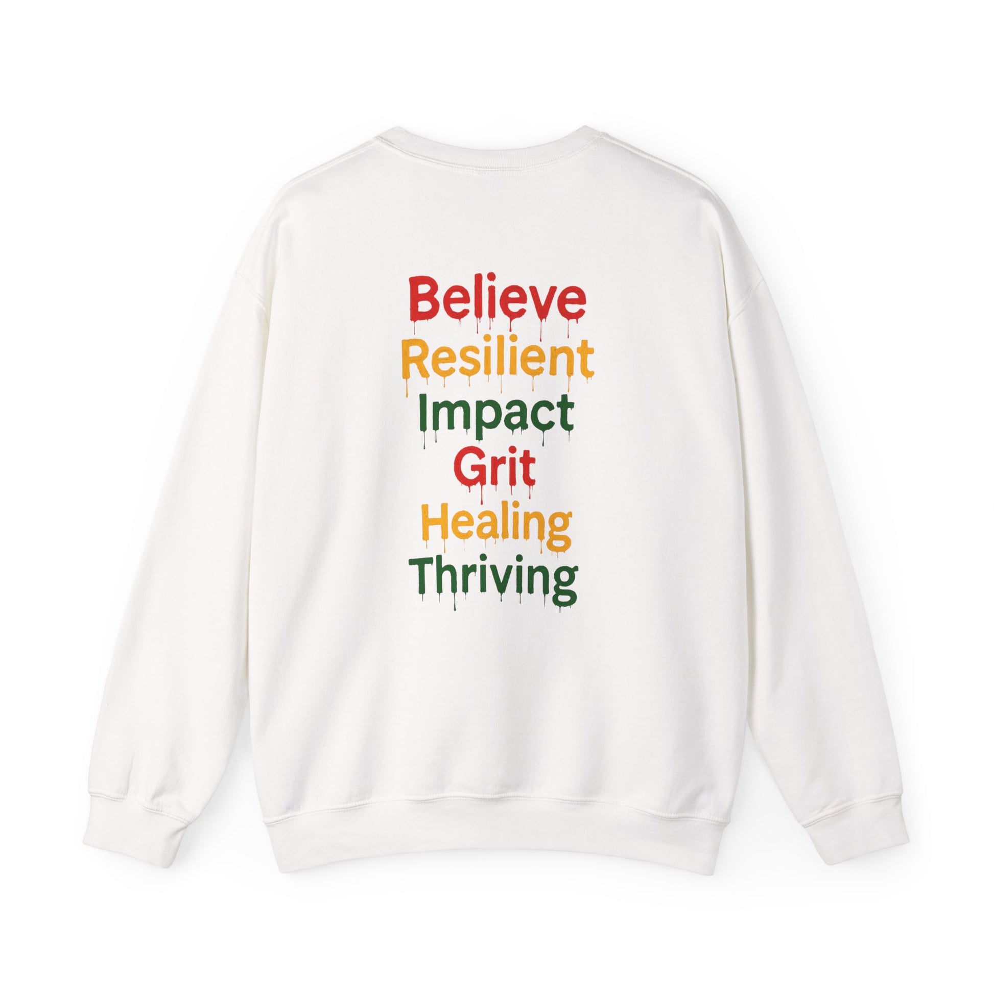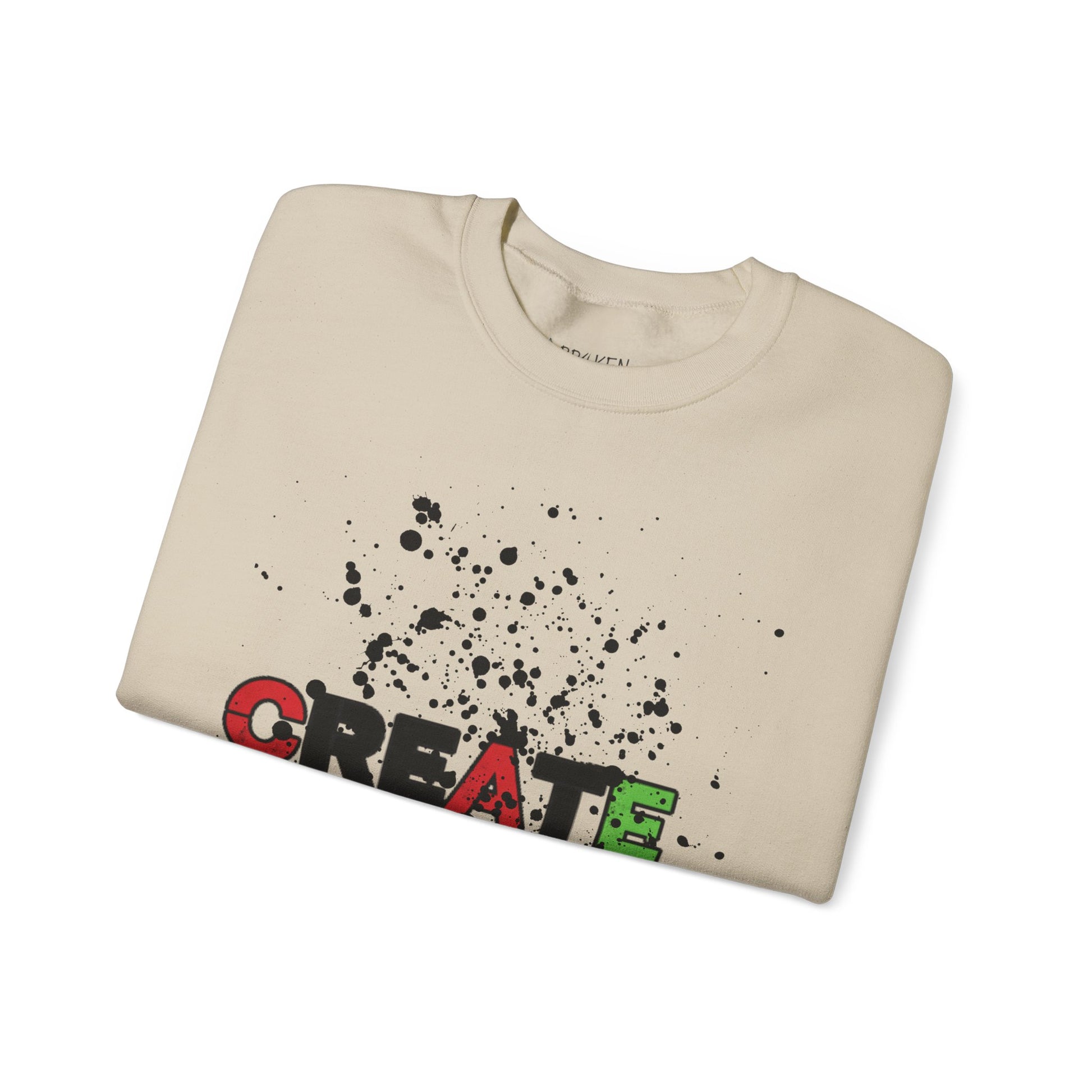 Part of the Broken Crayons Collection™, this beige crewneck sweatshirt fuses creativity and resilience. The front features a bold “CREATE” design in Pan-African colors with black splatter accents, while the back stacks six affirming words—Believe, Resilient, Impact, Grit, Healing, Thriving—each dripping with purpose. Designed for visionaries, educators, and movement-builders who wear their truth.