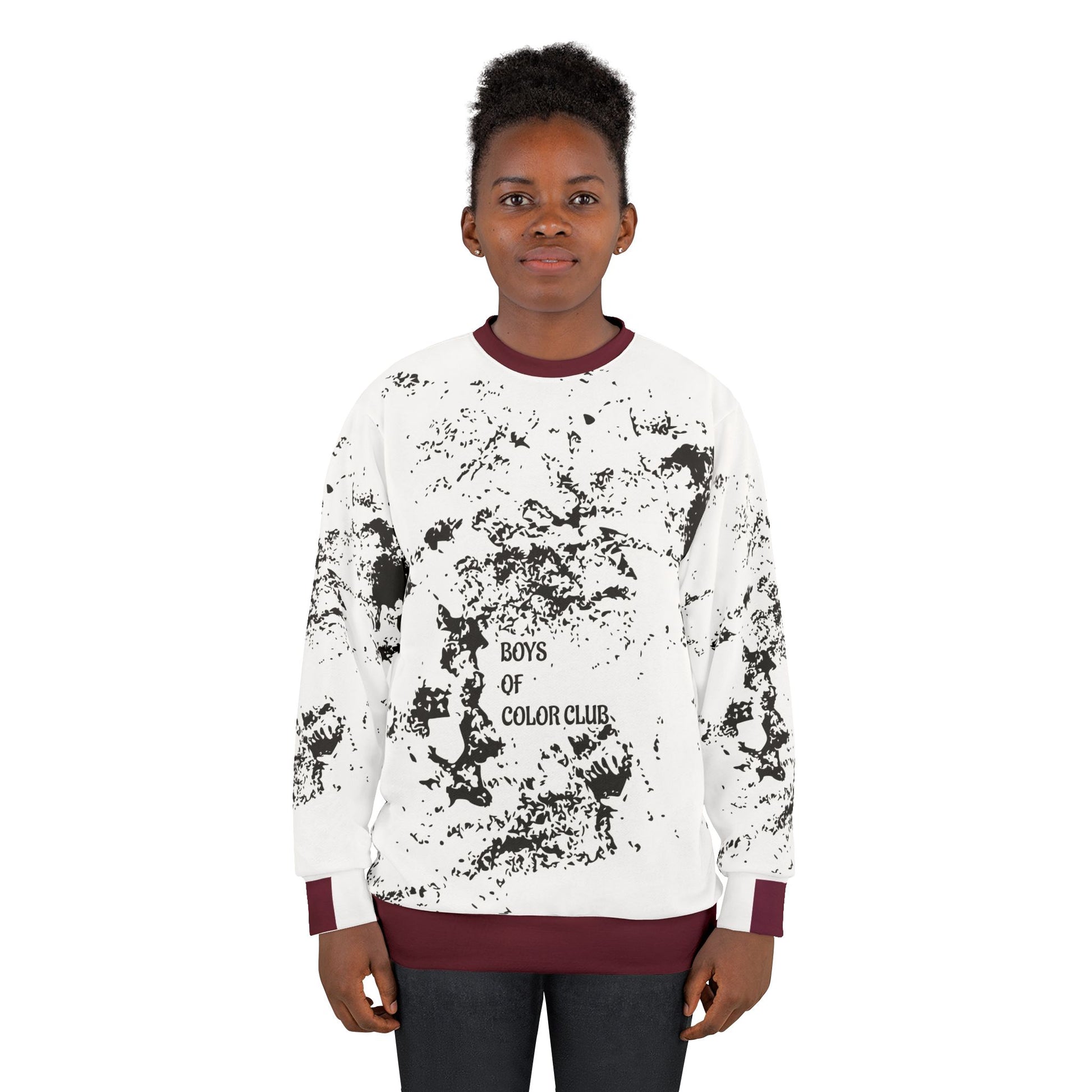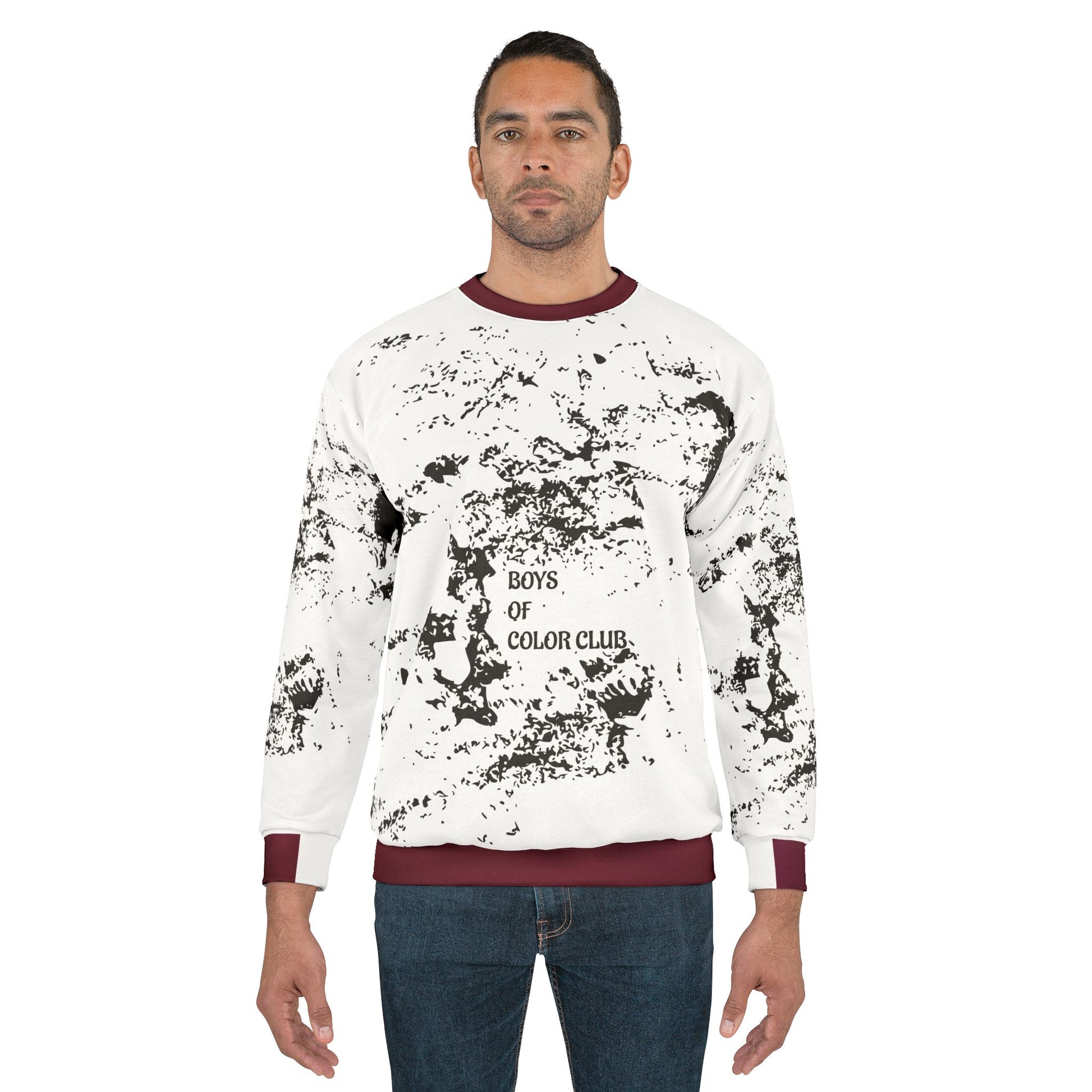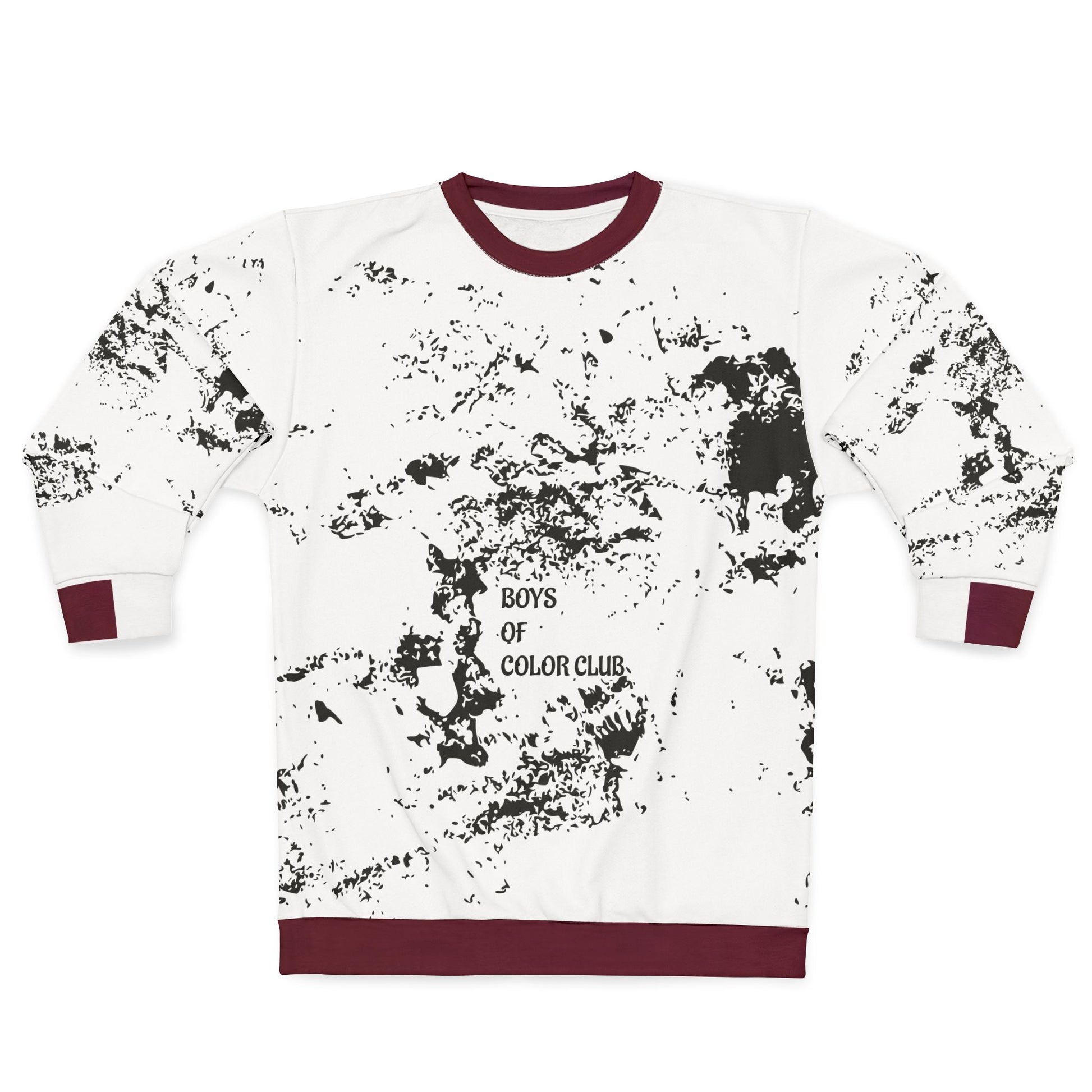 Make a bold statement while keeping it casual. This unisex crewneck features a striking black-splatter marble pattern over a crisp white base, accented with deep-burgundy ribbed cuffs, collar, and hem for a premium streetwear vibe.