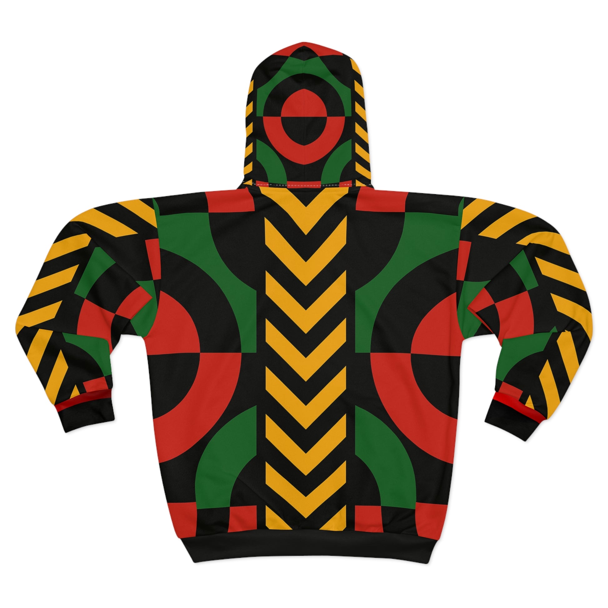 Step into the movement. This bold zip-up hoodie wraps you in the colors of resistance—red for the blood, black for the people, green for the land, and gold for the light we carry. Designed with symmetry and strength, each chevron stripe and curved arc echoes unity, pride, and purpose.
