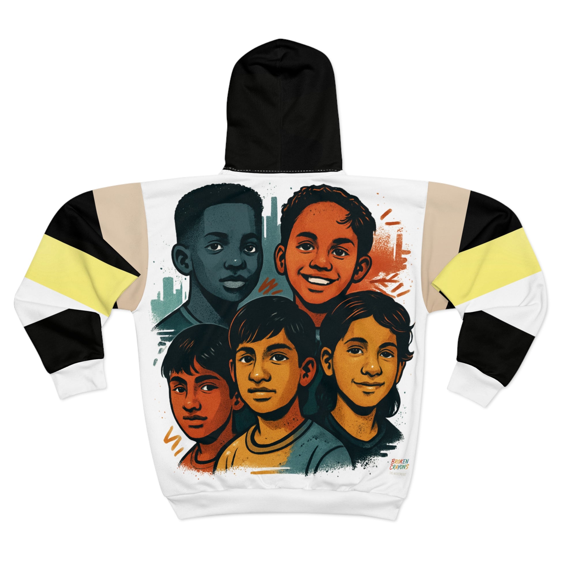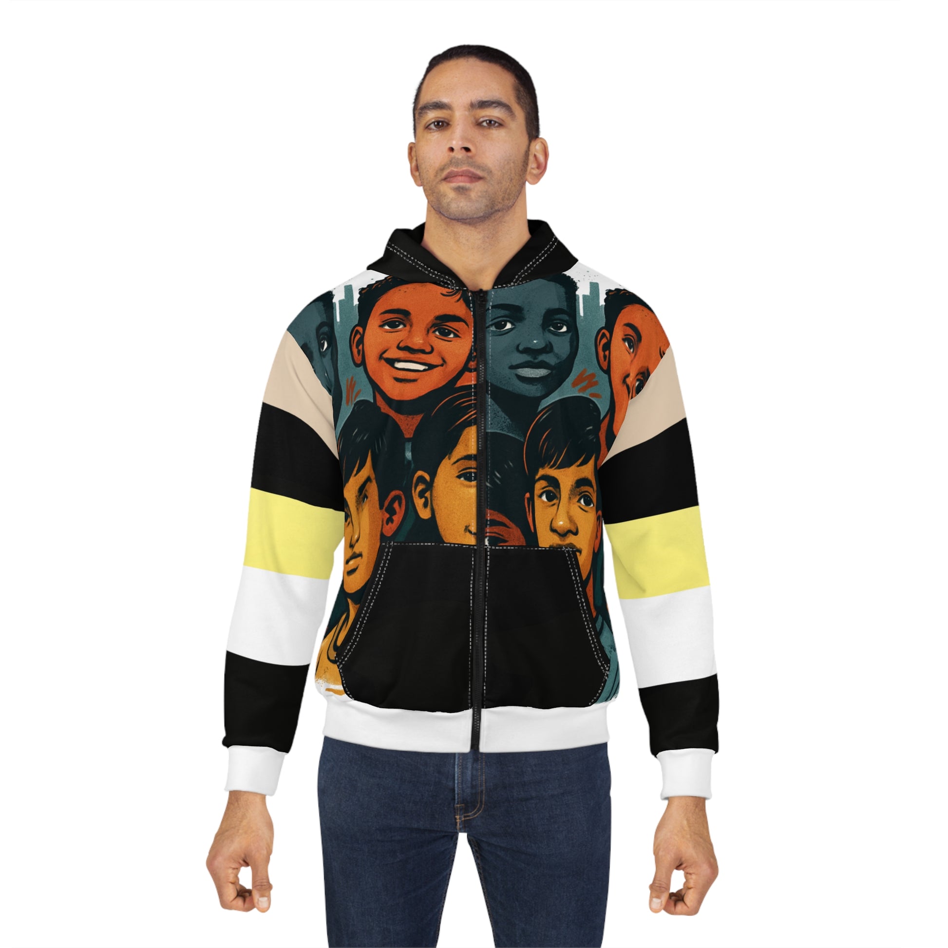 This all-over printed zip hoodie wraps bold, story-driven artwork around you — faces and expressions that feel like a neighborhood come to life. The medium-weight polyester holds vivid color and crisp lines so the illustrated portraits stay striking wash after wash. The roomy front pockets and classic fit make it easy to move through busy days while the black zipper and contrast stitching give it a handcrafted, urban edge. Wear it to carry a sense of community with you: a comfortable, durable layer that sparks conversation and keeps the artwork center stage.